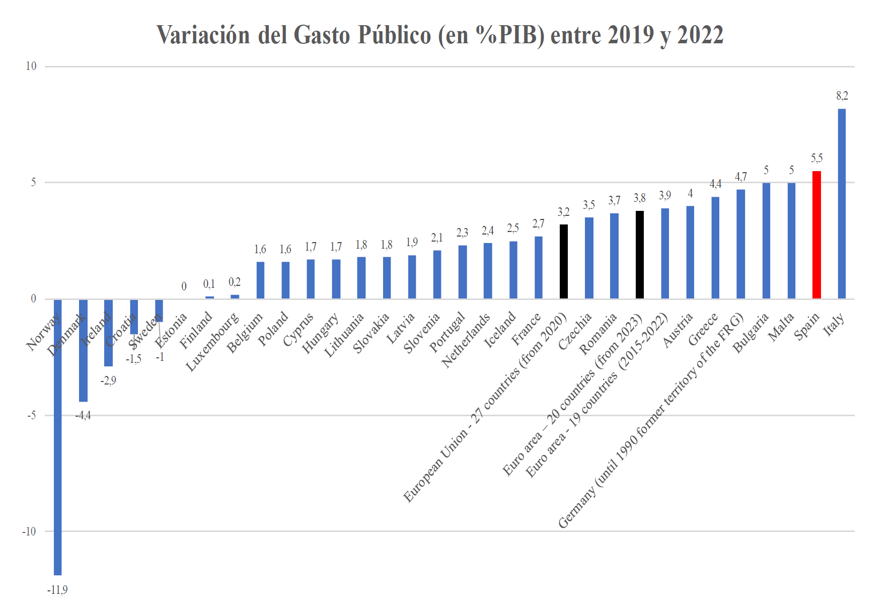 El problema, en embargo, es que, a pesar de que la recaudación fiscal alcanza cifras récord, el aumento del gasto público es incluso superior. A lo largo de la Legislatura 2019-2022, España ha experimentado el mayor incremento del gasto público en Europa, con 5,5 puntos, tan sólo superado por Italia, al pasar del 42% a casi el 48% del PIB.