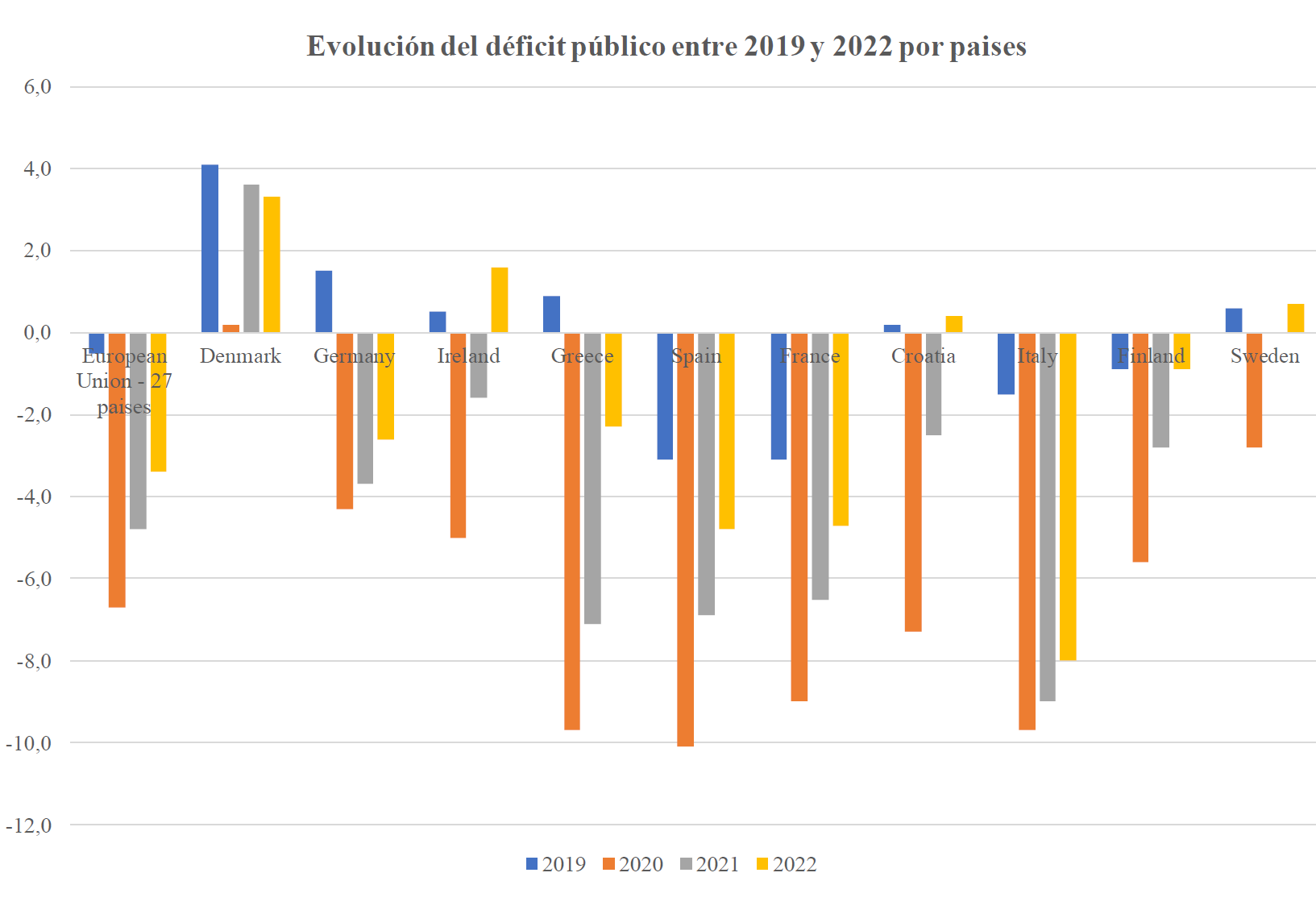 Y, dado que el ritmo de gasto ha sido superior al de los ingresos, España ha seguido registrando un fuerte déficit público durante estos años. En concreto, España es, junto a Francia, los países de la UE que cerraron 2022 con un déficit más elevado, sólo superados por Italia.