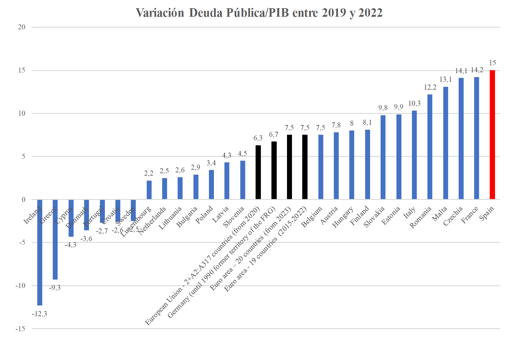 Ese agujero presupuestario se tiene que financiar con deuda. Y esa es la razón por la cual España también ha experimentado el mayor incremento de deuda pública de Europa, con casi 15 puntos adicionales desde 2019, al pasar del 98% al 113% del PIB nacional. España ha más que duplicado el crecimiento medio de la deuda de la UE durante el misio período.