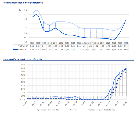 Si con esta tasa oficial de interés, el Euribor a 12 meses, tipo de referencia hipotecaria, ya supera el 4%, ¿hasta dónde puede llegar el coste de las hipotecas? Dado que los tipos oficiales del BCE y el Euribor evolucionan de forma similar, todo apunta a que en los próximos meses el interés medio que aplicarán las entidades financieras para conceder hipotecas avanzará hacia el 5%, desde el tipo medio del 3,7% que se registra en 2023.