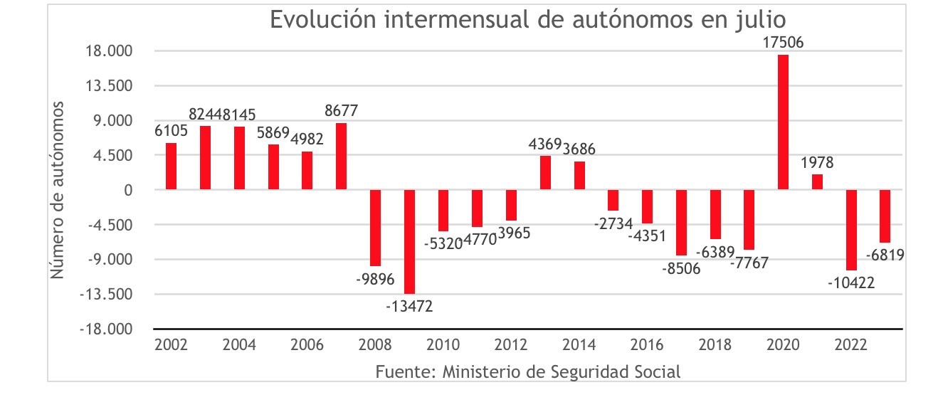 De hecho, en tasa interanual es el peor dato de autónomos de los últimos diez años -salvo el año 2020, en plenas restricciones por la pandemia-, al aumentar sólo en 3.617 personas.