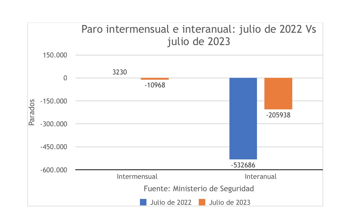 Por otra parte, en tasa interanual baja en 205.938 personas, que es el cuarto peor dato interanual de los últimos diez años (el tercero, sin contar 2020, cuando operaban las restricciones por la pandemia), con lo que la bajada no es especialmente destacable para este mes, hecho que muestra la ralentización interanual de la bajada del paro, comparando períodos homogéneos. La bajada se queda en menos de la mitad de lo que bajaba en junio del año pasado.