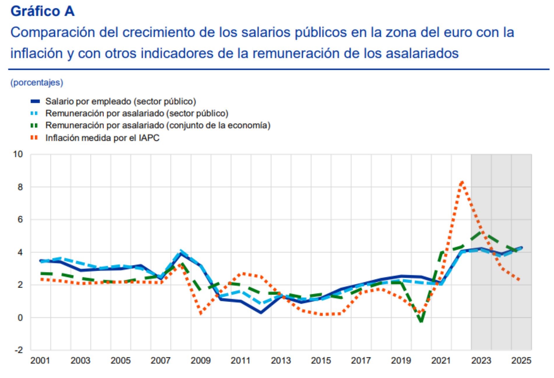 No obstante, según el BCE, entre 2023 y 2025, los salarios reales se recuperarán con un crecimiento nominal del 4,1 %. De este modo, de acuerdo con el organismo europeo, entre 2022 y 2025 el incremento de los salarios nominales del sector público mostrará "un desfase de unos 2,5 puntos porcentuales con respecto a la inflación".