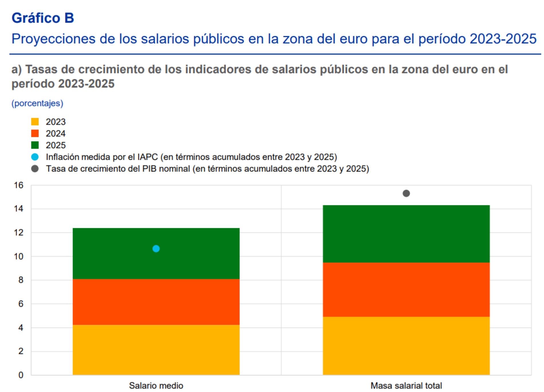Con todo, "la masa salarial total del sector público de la zona del euro, [...], aumentará a una tasa algo mayor (14,3 % en términos acumulados, en el período 2023-2025, frente al 12,4 % del salario público medio), aunque ligeramente por debajo de la tasa de crecimiento del PIB nomina".
