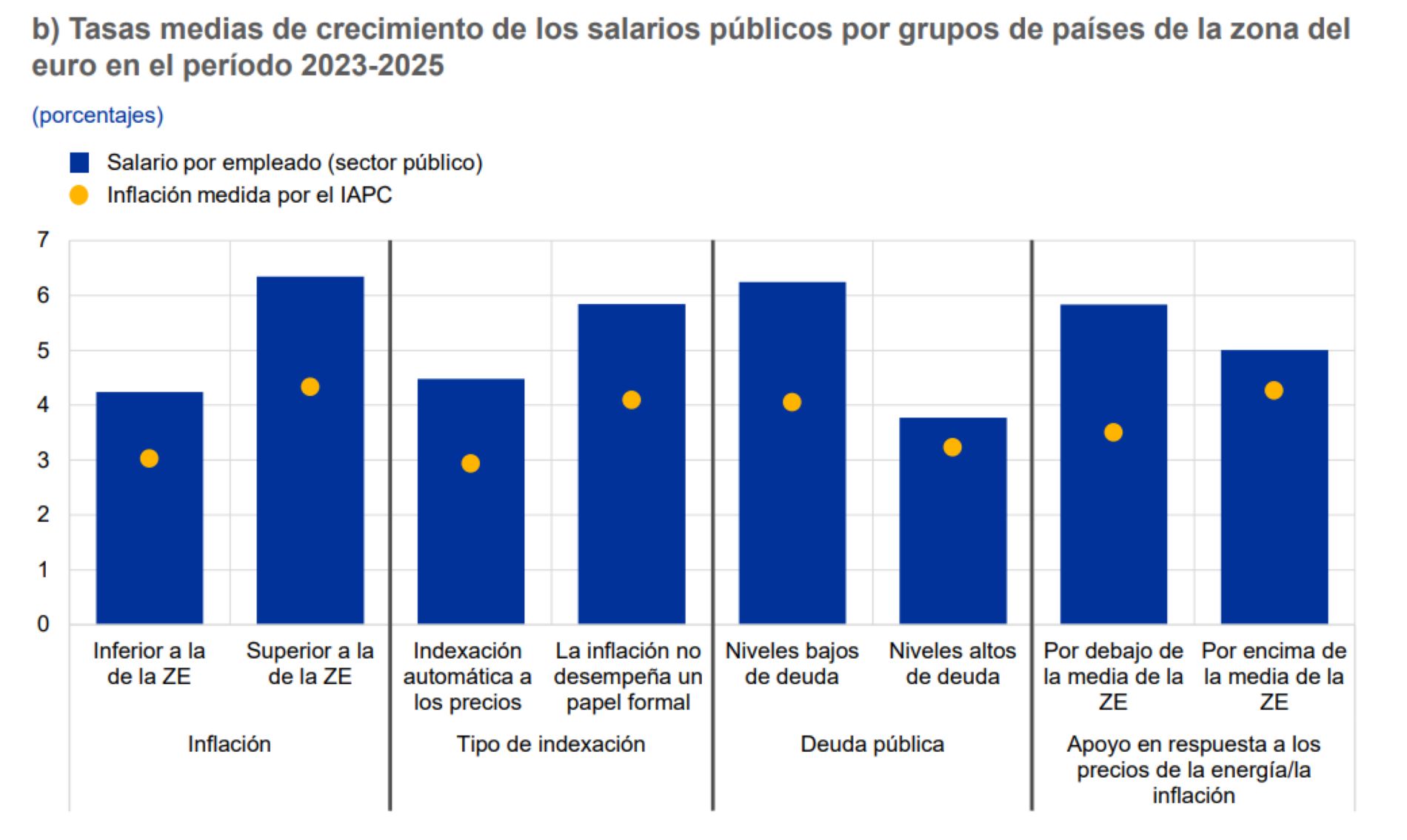 Concretamente, es en aquellos países que carecen de un sistema de indexación automático a la inflación forma donde "el incremento medio de los salarios públicos previsto es, de hecho, más acusado". Esto indicaría, según el organismo, que estos países estuvieron más expuestos al alza de los precios del año pasado y que la inflación se está reflejando en la fijación de los salarios nominales.