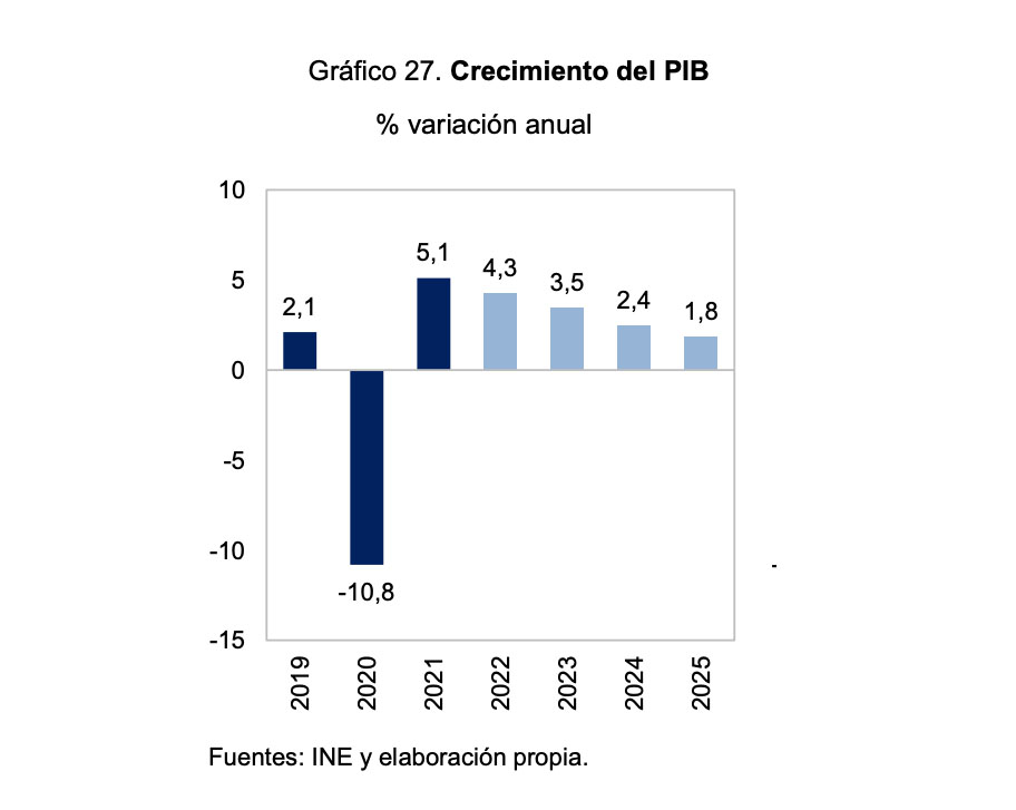 Ciñéndonos a las expectativas macroeconómicas que ha reflejado el gobierno de Pedro Sánchez en su Programa de Estabilidad para los años 2022-2025, encontramos que la mejora del PIB planteada por el Ejecutivo será del 2,4% en 2024 y del 1,8% en 2025. Superado el efecto de la pandemia –que hundió un 10,8% el PIB de 2020 y propició un rebote del crecimiento con tasas del 5,1% en 2021, 4,3% en 2022 y 3,5% en 2023–, el ritmo de expansión de la economía de nuestro país volvería a moverse en torno al 2%.