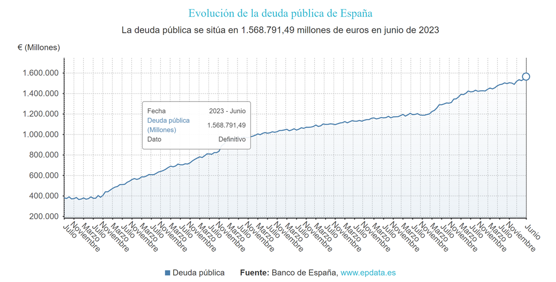 Casi 1,6 billones de euros. Esta es la deuda pública total que acumula España a junio del presente año. Se trata de un nuevo récord histórico en términos nominales y representa el 113% del PIB nacional, uno de los niveles de endeudamiento más altos del último siglo.