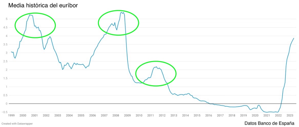 ¿Quiere esto decir que el euríbor bajará al 3% este año o el que viene y se mantendrá en ese nivel? Es imposible saberlo con certeza. Pero lo que sí parece que es muy probable que suceda es que, vuelva a un entorno cercano a su media histórica cuando termine su espiral alcista. Lo que todavía no se puede decir es si ha tocado o no techo el indicador, pero sí podemos decir que, atendiendo a lo sucedido en el pasado, no sería descartable que este periodo de tipos altos no se prolongue más allá de dos o tres años.