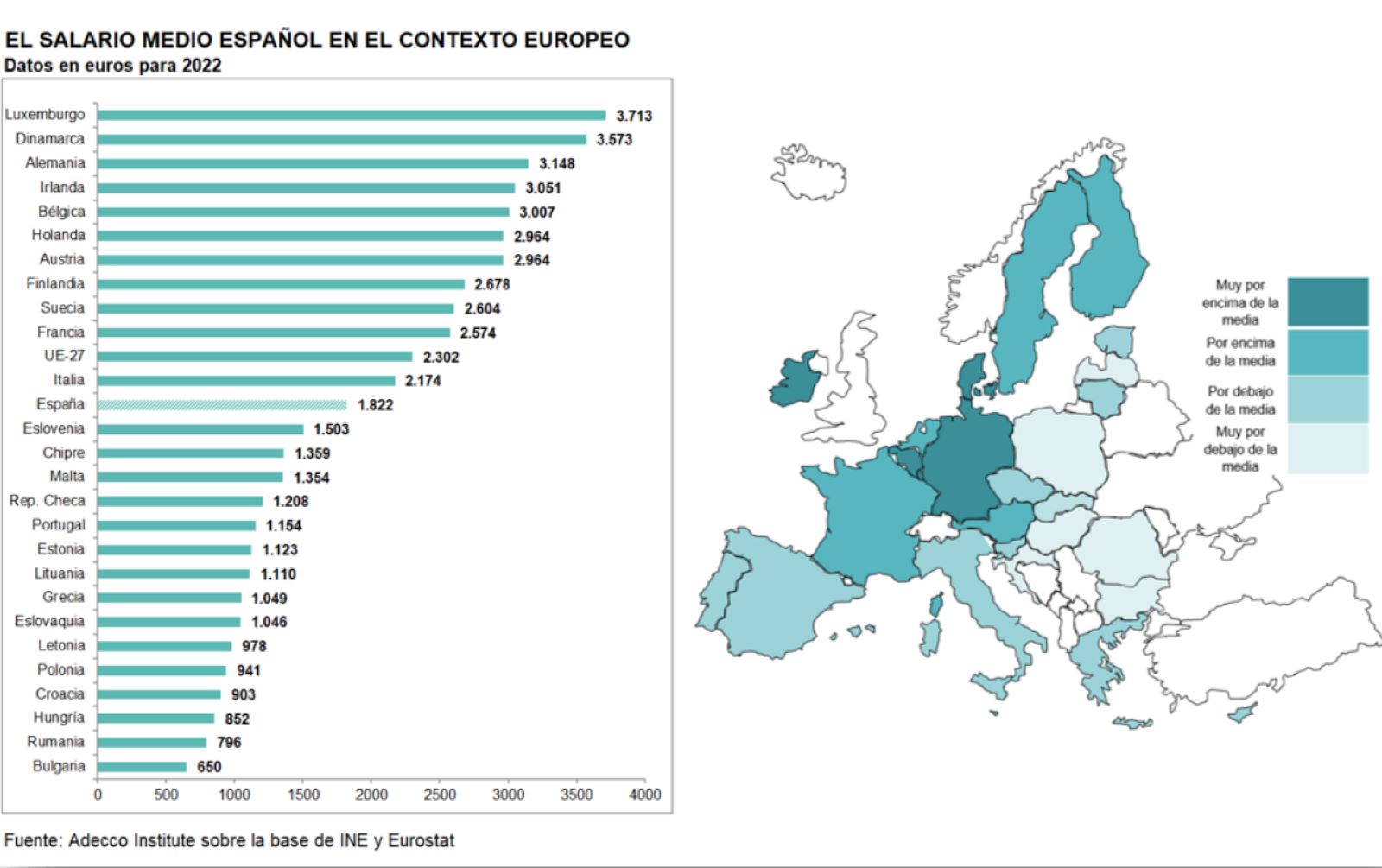 Si bien es cierto que, de esta forma, el salario bruto español se sitúa en una posición intermedia dentro del conjunto de la Unión Europea, y aunque según Adecco la brecha entre los salarios europeos se haya ido reduciendo desde 2010, en términos absolutos nuestro país aún está más cerca de la peor de las cifras que del mejor dato: mientras que el diferencial entre el salario ordinario bruto español y el de Luxemburgo (el mejor situado, con 3.713 euros al mes) nos reporta una pérdida de 1.891 euros mensuales, respecto de los trabajadores búlgaros (el peor de los datos, con 650 euros cada mes) los españoles se sitúan por encima con una diferencia de 1.172 euros al mes.