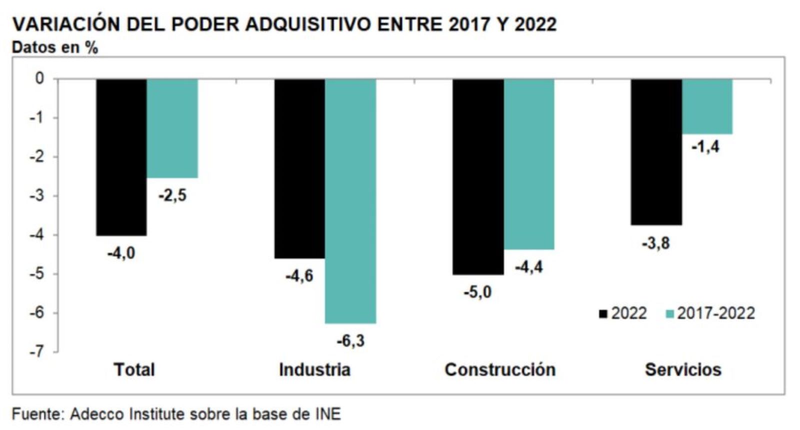 Desde que Pedro Sánchez llegó al poder en junio de 2018, las condiciones de vida han empeorado considerablemente en nuestro país. Adecco, en otro estudio publicado el pasado mes de julio, explicaba cómo el salario medio español, a pesar del incremento que había experimentado (un 4%), en 2022 perdió poder de compra por una proporción del 4% respecto del año anterior, puesto que la inflación media cerró 2022 en el 8,4% . Este fenómeno, además, fue generalizado en nuestra economía, pues afectó a todos los sectores.
