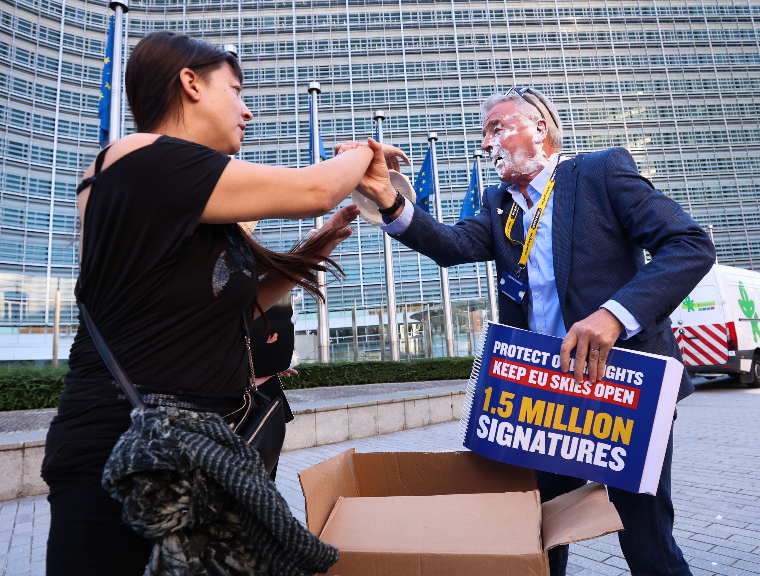 O'Leary se disponía a hacer unas declaraciones a la prensa delante de la sede de la Comisión Europea (CE), cuando las energúmenas le han pillado por sorpresa arrojándole a la cara una tarta mientras le decían "bienvenido a Bélgica".