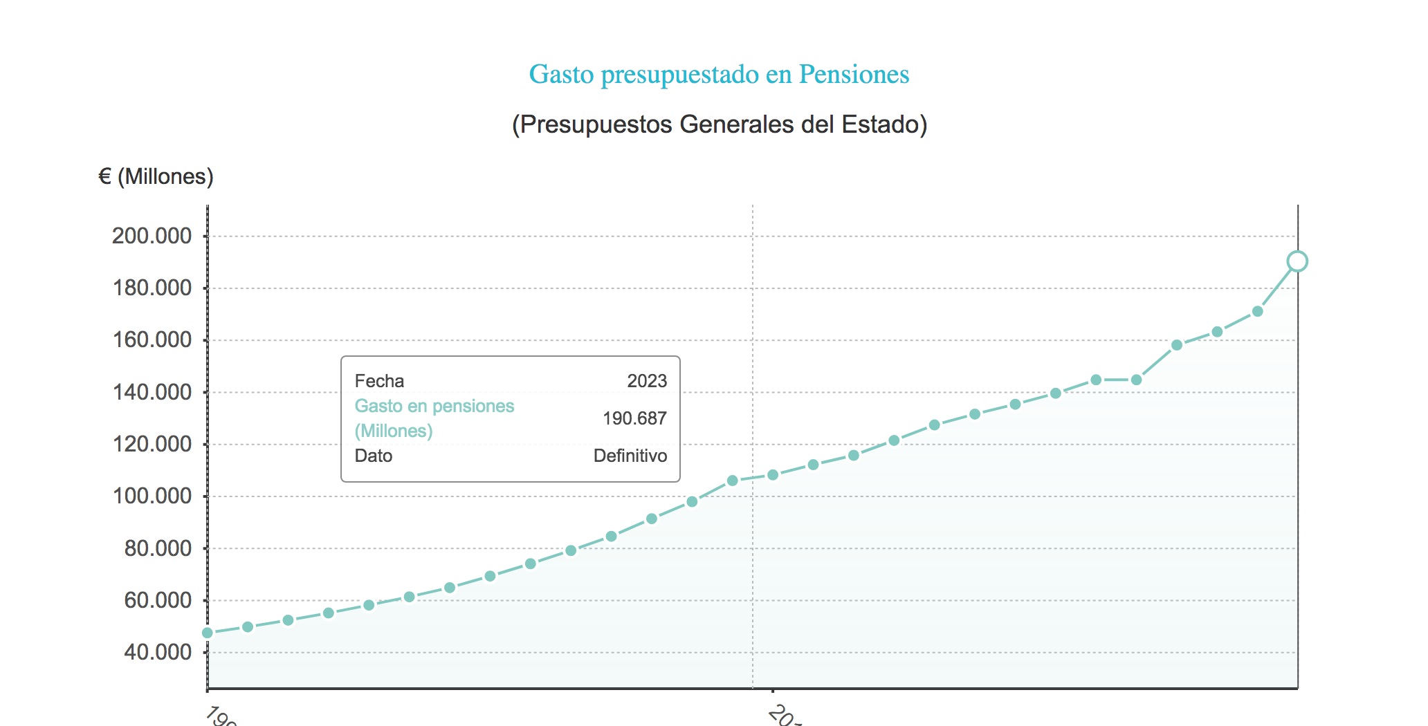 Así, el gasto total en pensiones este año se ha presupuestado en el récord histórico de 190.687 millones de euros, 46.000 millones más desde que Sánchez llegara al gobierno en 2018 y 69.000 millones más que hace una década. Como se observa en la tabla, el gasto en pensiones ha ido creciendo año a año sistemáticamente desde que hay registros, pero la escalada más grande se ha producido en 2023.