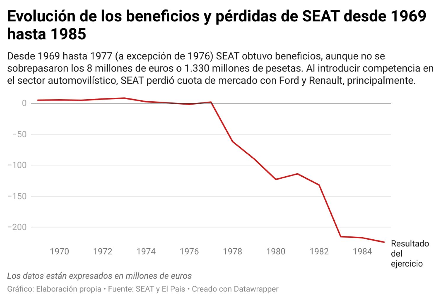 Como podemos observar, el resultado positivo de SEAT entre 1969 y 1977 apenas consiguió un beneficio total de 31 millones de euros (o 5.157 millones de pesetas), mientras que desde 1978 hasta 1985 perdió la friolera de 1.177 millones de euros (o 195.836 millones de pesetas). A todas estas pérdidas habría que añadir las continuas subvenciones (sólo entre 1982-1984 recibió 356 millones de euros) o las inyecciones de capital social del INI (entre 1982-1986 recibió 1.160 millones de euros), por lo que el agujero que SEAT provocaba en las arcas públicas era mucho mayor del que se veía reflejado en su resultado del ejercicio.