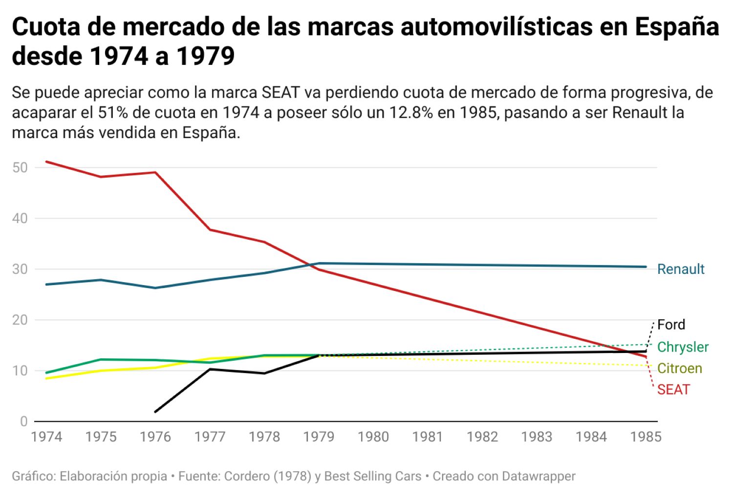 En este sentido, y viendo que casi toda la producción de SEAT se orientaba al mercado nacional, si observamos la evolución de las ventas de SEAT en el mercado español veremos el motivo por el cual la empresa estatal comenzó su descalabro, y no es otro que su pérdida de cuota de mercado.