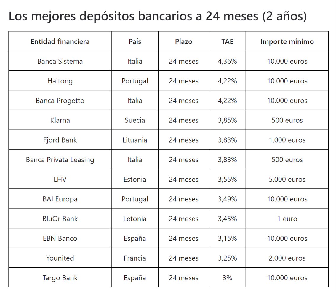 Según el ranking elaborado por Finect, los mejores depósitos bancarios a 24 meses disponibles para los ahorradores españoles en septiembre son, por este orden, los que ofrece el italiano Banco Sistema, el portugués Haitong y el también italiano Banca Progetto, con intereses superiores al 4% anual.