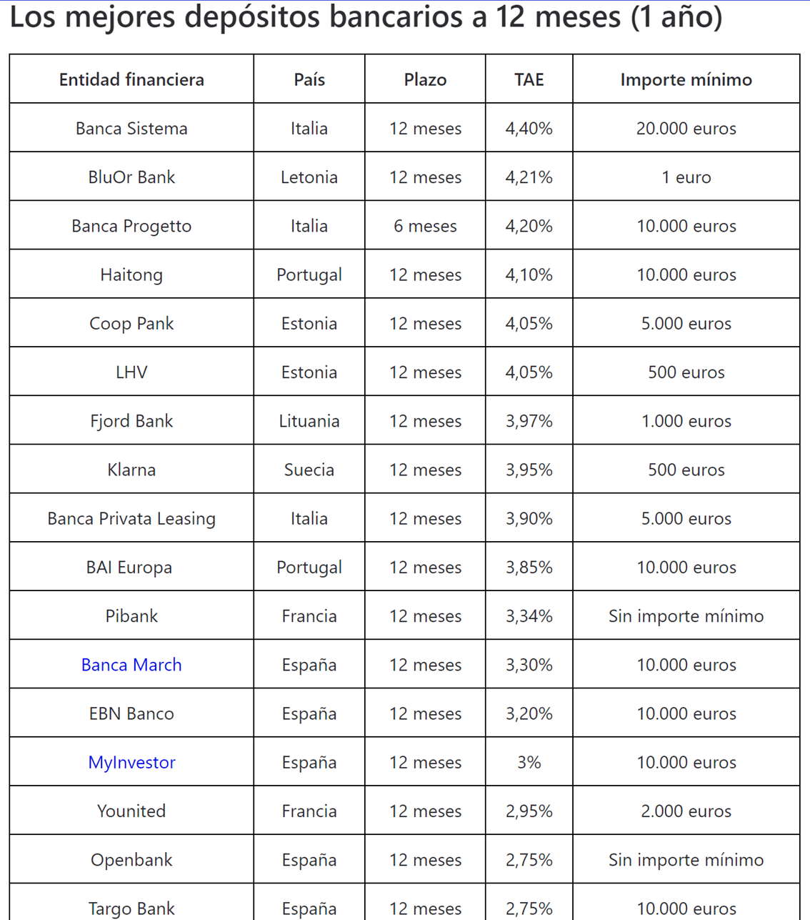 Los mejores depósitos a 12 meses también son los de Banca Sistema y el letón BluOr Bank.