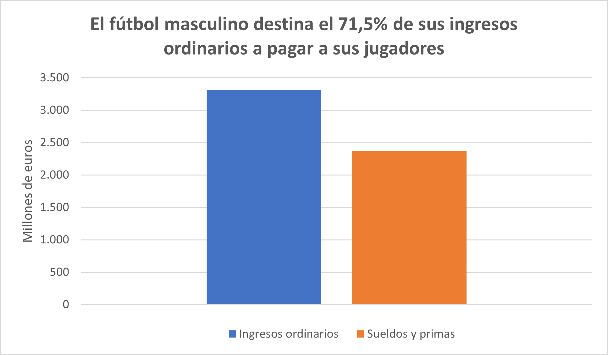 ¿Y cuánto dinero destinaron a sus jugadores? 2.369 millones de euros al pago de nóminas y primas, excluyendo el coste de los fichajes. Así pues, el fútbol profesional masculino de Primera División destinó el 71,5% de sus ingresos ordinarios a pagar el sueldo de sus jugadores.