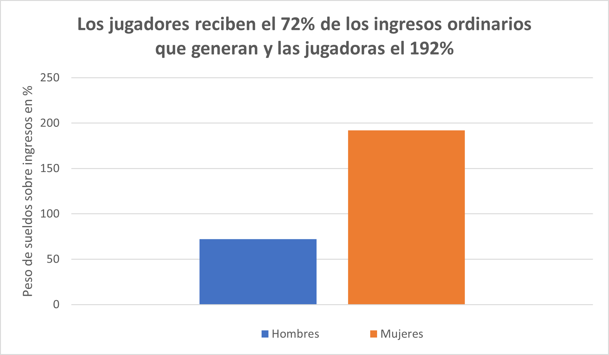 Visto lo visto, las futbolistas españolas no sólo no están mal pagadas, sino que cobran el doble de lo que generan y más del doble que los jugadores masculinos en función del porcentaje de ingresos ordinarios que se destinan al pago de sueldos: los hombres reciben el 72% de los ingresos que producen, mientras que las mujeres reciben el 192%.