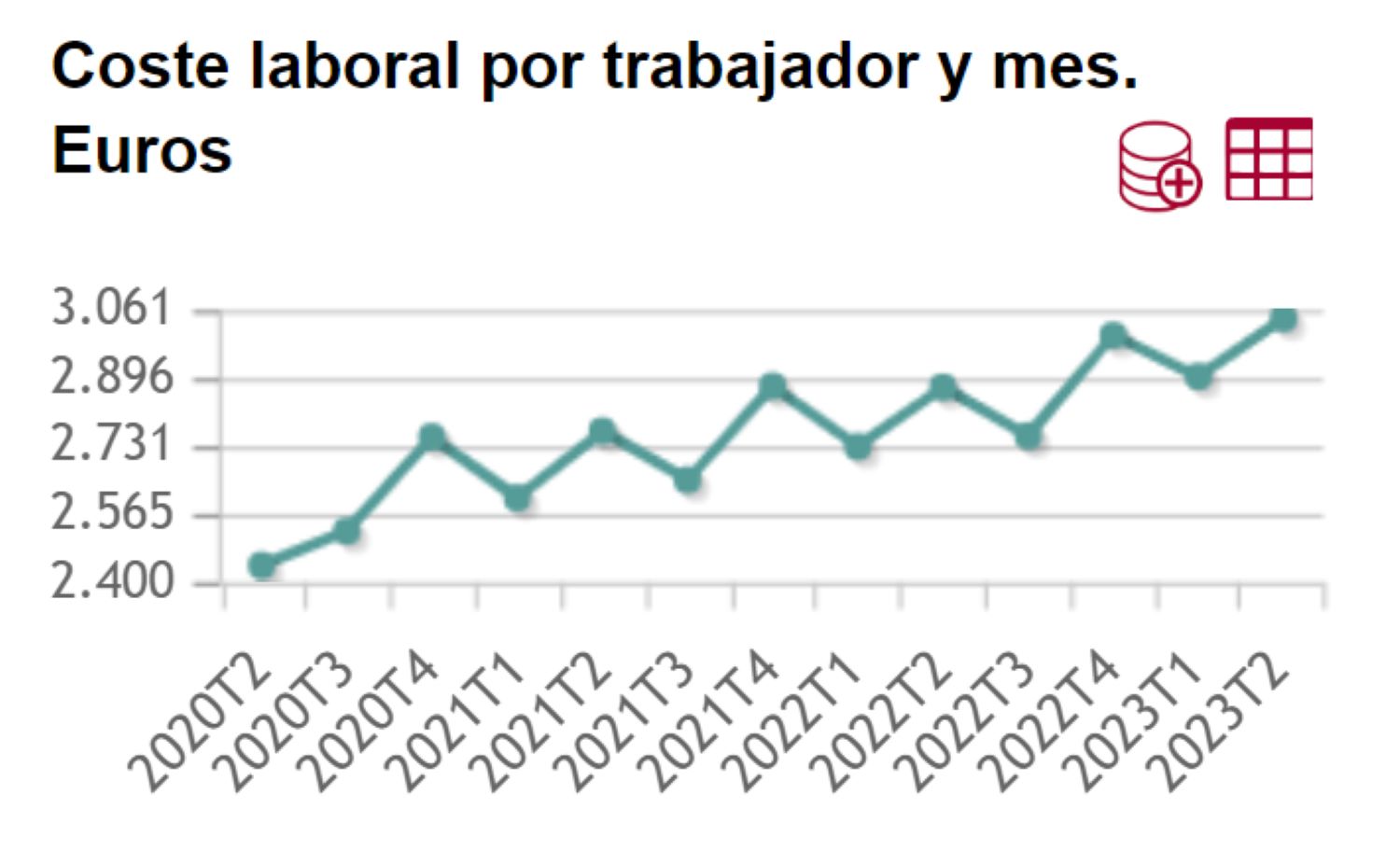 El coste laboral se compone del coste salarial y de los otros costes. Entre abril y junio, los salarios (todas las remuneraciones, tanto en metálico como en especie) subieron un 5% interanual en términos brutos, hasta situarse en una media de 2.262,63 euros por trabajador y mes, la cifra más elevada en un segundo trimestre desde el comienzo de la serie, en el año 2000. Excluyendo el factor variable de los salarios (pagos extraordinarios y atrasados) se obtiene el coste salarial ordinario, que en el segundo trimestre del año repuntó un 5,5%, hasta los 1.907,68 euros mensuales.