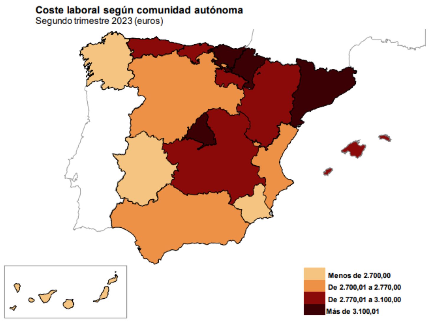 Por comunidades autónomas, los costes laborales más altos los registraron Madrid (3.562,1 euros por trabajador y mes), País Vasco (3.378,5 euros), Navarra (3.334 euros) y Cataluña (3.313,7 euros). Por contra, los más bajos se dieron en Extremadura y Canarias, con 2.409,1 y 2.584,3 euros, respectivamente. El coste laboral aumentó en todas las regiones en el segundo trimestre de 2023 en tasa interanual. Baleares y Navarra presentaron los mayores repuntes, del 10,9% y del 8,3%, respectivamente, mientras que Extremadura y Comunidad Valenciana registraron los incrementos más moderados, con alzas del 3,5% y del 3,6%, respectivamente.