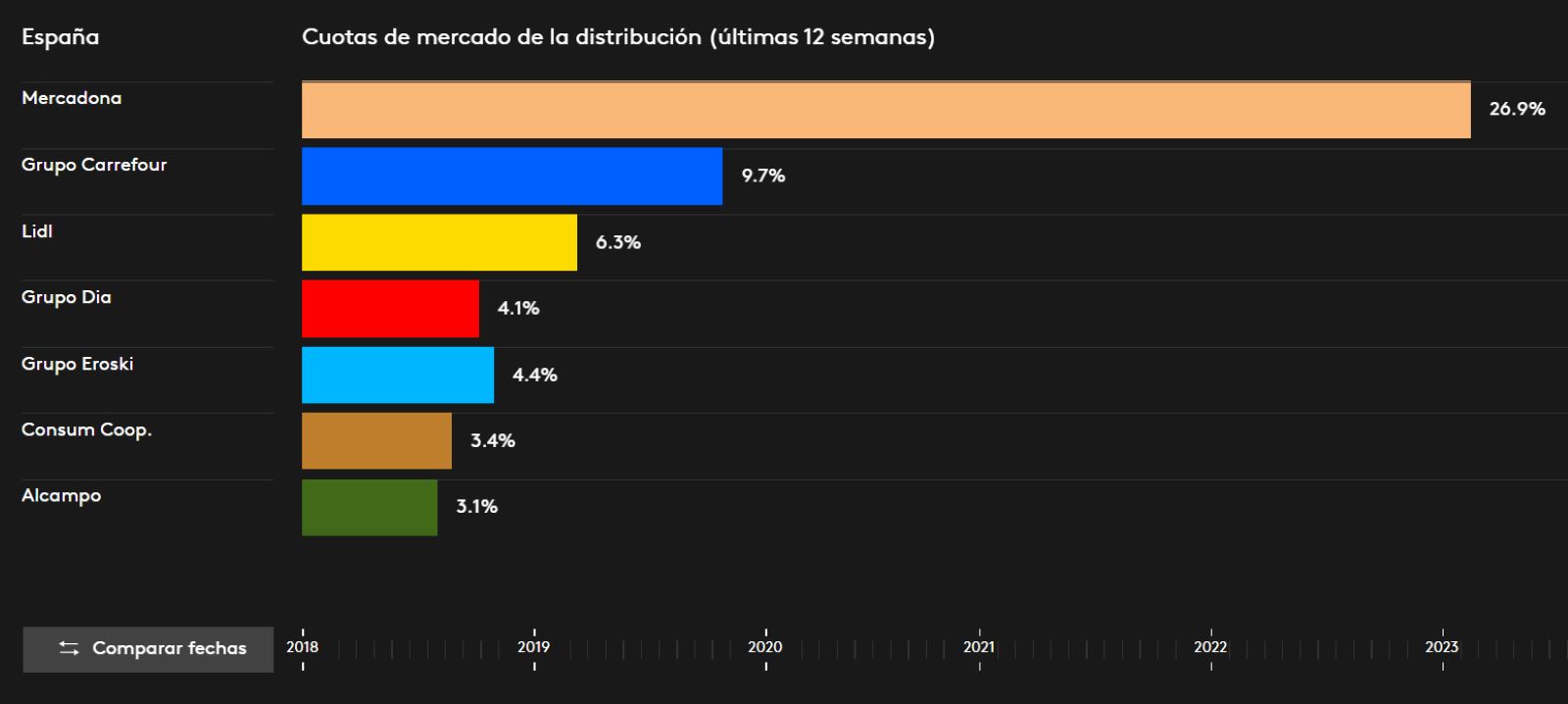 La mayoría de sus empresas rivales en agosto han visto cómo se reducían sus respectivas cuotas de mercado. Así se desprende de los datos proporcionados por la consultora, que muestra cómo Carrefour, la segunda cadena con mayor cuota de mercado (con un 9,7%) viene decreciendo desde abril (cuando suponía el 10,1% del mercado).