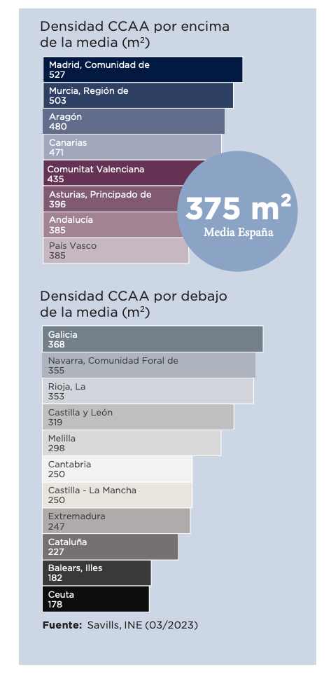 Los datos reflejan un desempeño totalmente opuesto en ambos territorios. De acuerdo con un estudio de la consultora Savills, la tasa de densidad comercial (medida como el número de negocios por cada 1.000 habitantes) ha alcanzado un valor de 527 en Madrid, pero apenas llega a 227 en Cataluña. Esto hace que la primera autonomía ocupe el primer puesto del ranking, mientras que la segunda figura en el penúltimo lugar del índice con 227. Solamente Baleares tiene un resultado peor (182).