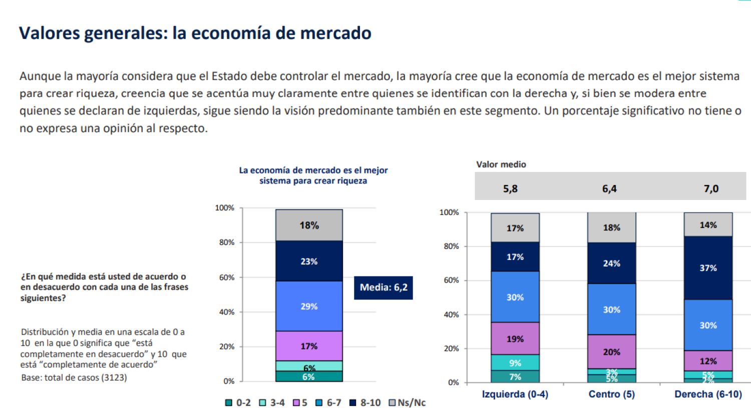 Según este estudio, a la mayor parte de los españoles les agrada la idea de que el Estado intervenga fuertemente en la economía, siendo un 50% de los encuestados favorables a esta afirmación, mientras que sólo un 31% prefiere que el Estado intervenga lo menos posible en la economía. Esto podría ser un indicativo de que los españoles están en contra de la economía de mercado, pero nada más lejos de la realidad. Curiosamente, el 69% de los españoles le da un aprobado a la afirmación de "La economía de mercado es el mejor sistema para crear riqueza", siendo de un 23% quienes están completamente de acuerdo con dicha afirmación. Con lo cual podemos deducir que, si bien la mayoría de la gente confía en la economía de mercado, no deposita en ella la confianza suficiente como para que sea a través de este mecanismo como se alcancen los fines de bienestar social, pidiendo la intervención del Estado para lograr dichos fines.