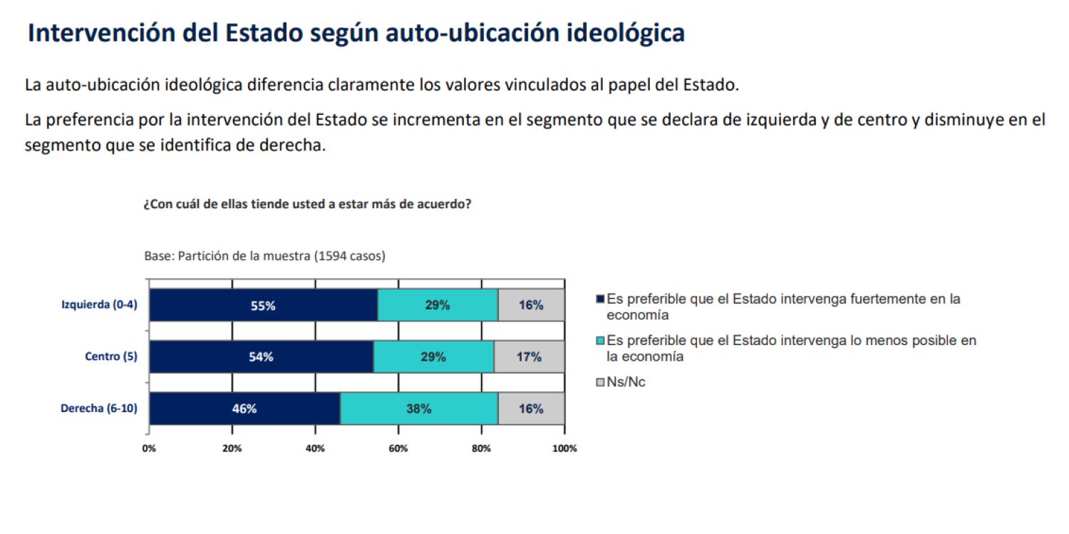 En cuanto a la ubicación ideológica, son las personas que se encuadran en la "izquierda" quienes más solicitan la intervención del Estado en la economía, siendo de un 55% quienes piden una fuerte intervención estatal en la economía, por un 29% que cree que es preferible que el Estado intervenga lo menos posible. No obstante, esta diferencia no es significativa con aquellas personas ubicadas en la "derecha", ya que estas también piden una fuerte intervención estatal en la economía, siendo de un 46% quienes lo demandan, por un 38% que prefieren que el Estado intervenga lo menos posible.