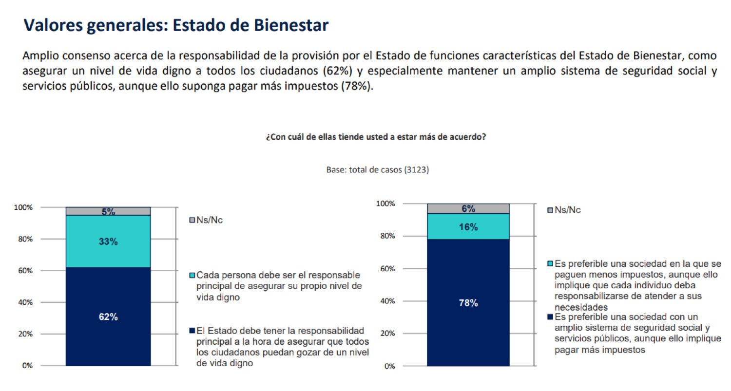 Algo sobre lo que también hay consenso es sobre el papel del Estado en cuanto a la vida del ciudadano, ya que el 62% de los españoles otorgan al Estado la responsabilidad principal a la hora de asegurar que todos los ciudadanos puedan gozar de un nivel de vida digno. Por otro lado, un 78% de la población prefiere una sociedad con un amplio sistema de seguridad social y servicios públicos, aunque ello implique pagar más impuestos. Tan sólo un 16% prefiere una sociedad en la que se paguen menos impuestos a cambio de que cada ciudadano deba responsabilizarse de atender sus necesidades. Si algo queda claro es que la existencia del Estado del Bienestar parece algo incuestionable, independientemente de la tendencia ideológica del encuestado.
