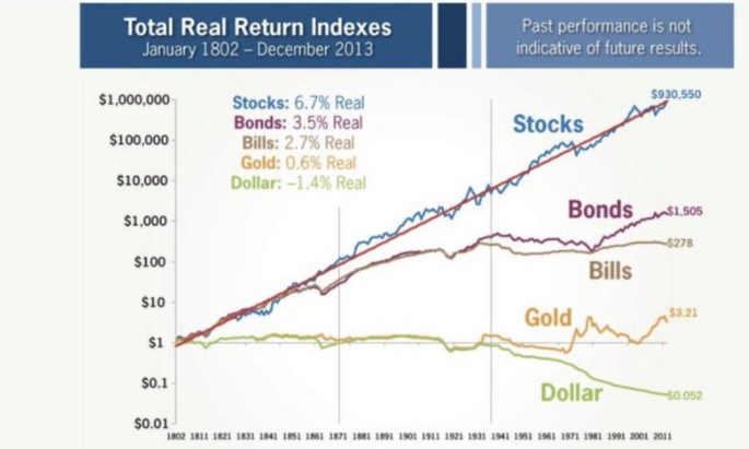 Por el contrario, la Bolsa (tomando como referencia EEUU) es la mejor inversión a largo plazo en términos reales (descontando inflación), ya que ofrece una rentabilidad media próxima al 7%, frente al 3,5% de los bonos y el 2,7% de las letras, tras más de dos siglos de historia.