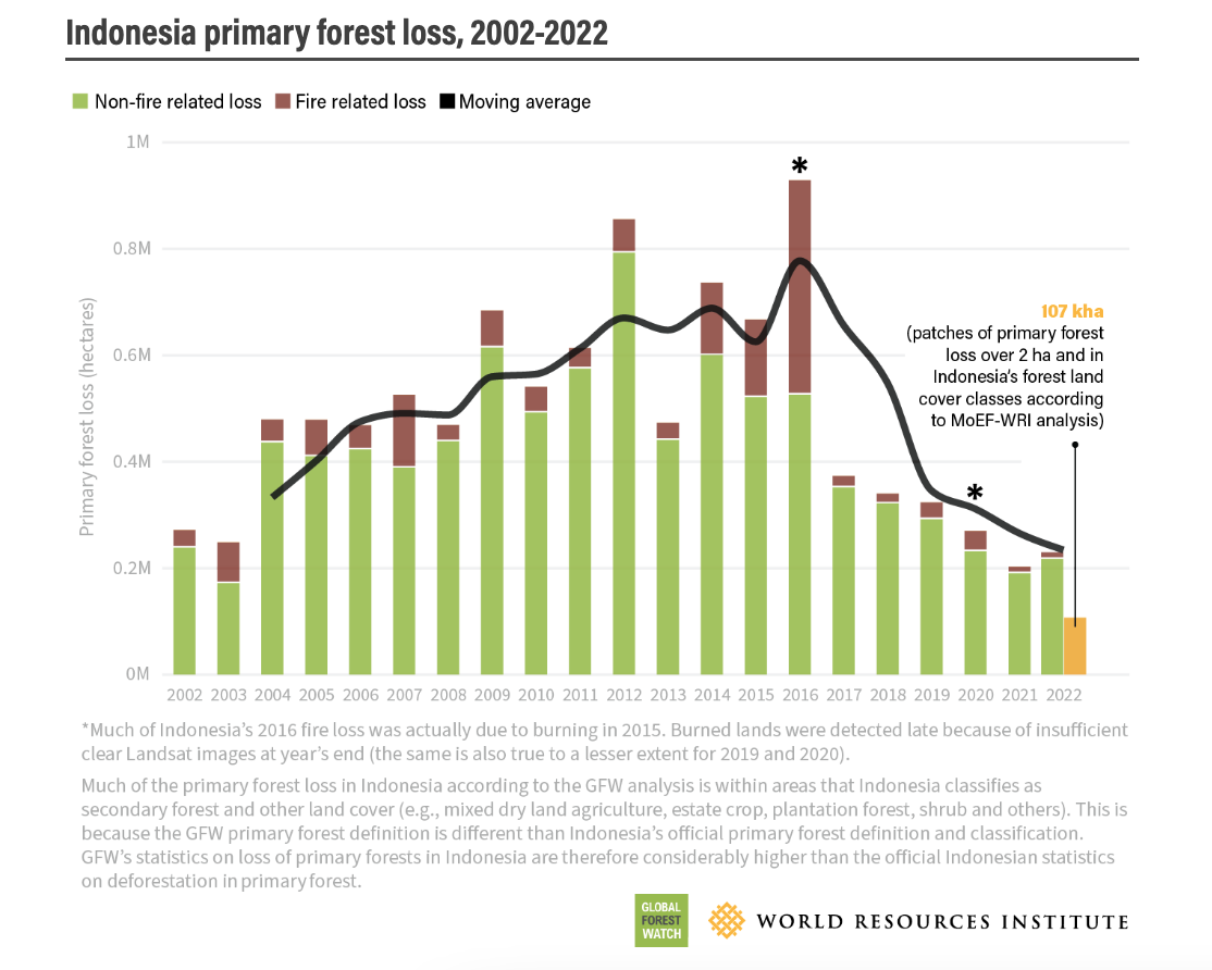 Si repasamos más detalladamente las cifras de Indonesia, encontramos que la deforestación provocada por la actividad humana tocó techo en 2012 y se ha reducido desde entonces. Si se consideran también las pérdidas de superficie de bosque provocadas por incendios, el pico se alcanzó en 2016. De modo que la evolución es claramente a mejor, como vemos en el siguiente gráfico.