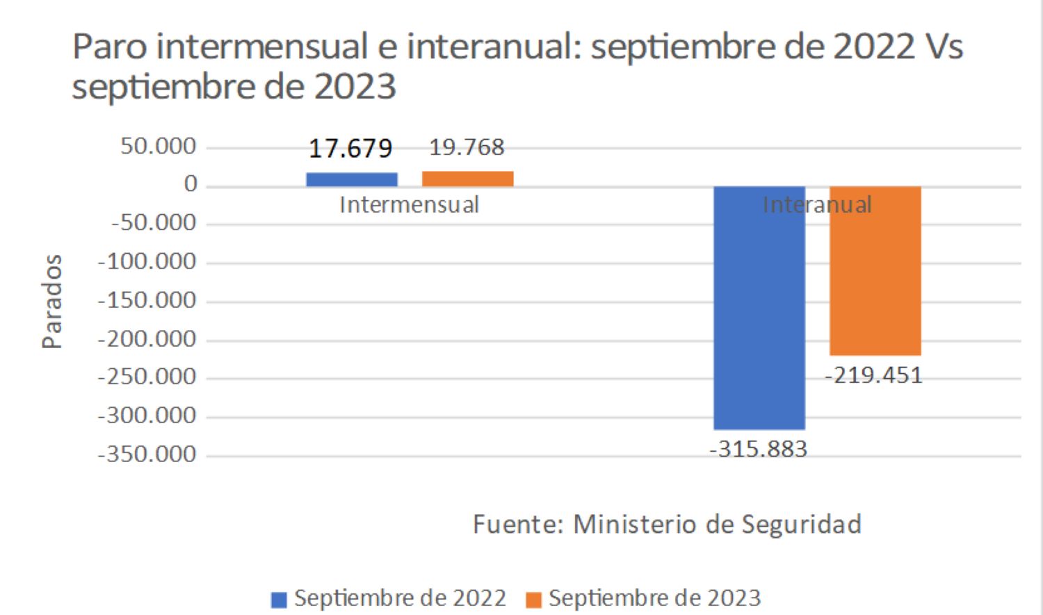 No sólo es que el empleo que se creó en los meses anteriores no fuese sólido: realmente, no se crea empleo, sino que se reparte empleo, en línea con el descenso de horas efectivamente trabajadas que muestra la contabilidad nacional trimestral en tasa interanual del IITR-2023; es que este mes aumenta el paro y se ralentiza el empleo, siendo sus cifras el peor de los últimos tres años de un mes de septiembre en tasa mensual. De hecho, este mes descienden con fuerza los contratos indefinidos en tasa interanual, haciéndolo un 19,65%, equivalente a 152.417 contratos indefinidos menos en tasa interanual, que demuestra que los incrementos del año pasado se debían al artificio de la reforma laboral, que obliga a la transformación de temporales en indefinidos fijos-discontinuos.