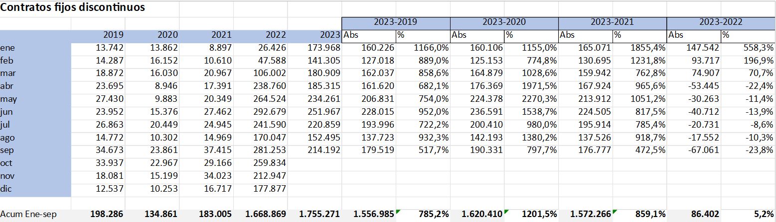En 2022 hubo, al menos, un artificio de más de un millón y medio de este tipo de contratos acumulado en el año, con muchos trabajadores que firman varios contratos indefinidos a lo largo del mes al haberse prohibido la contratación temporal y no optar algunas empresas por la figura del fijo-discontinuo, sino por breves contratos indefinidos. En enero, febrero y marzo de 2023, prosiguió el efecto del artificio normativo, que empezó a corregirse, por comparación estadística, en abril y continúa, por los mismos motivos, en mayo, junio, julio, agosto y septiembre.