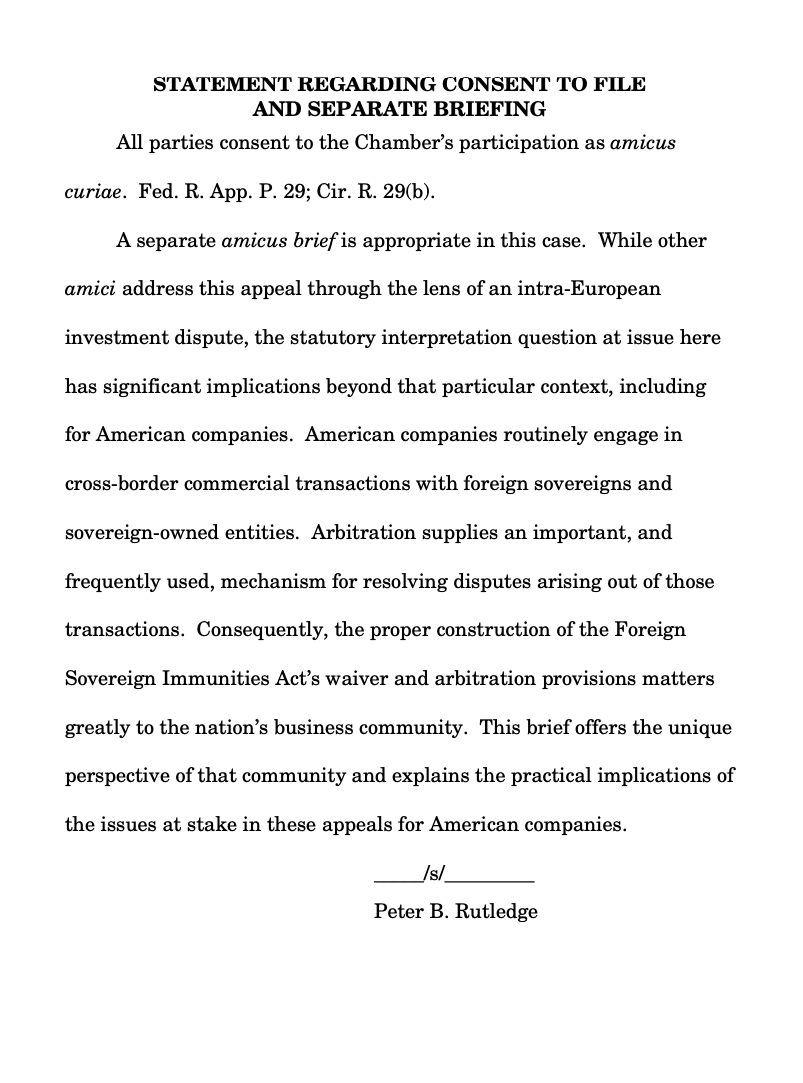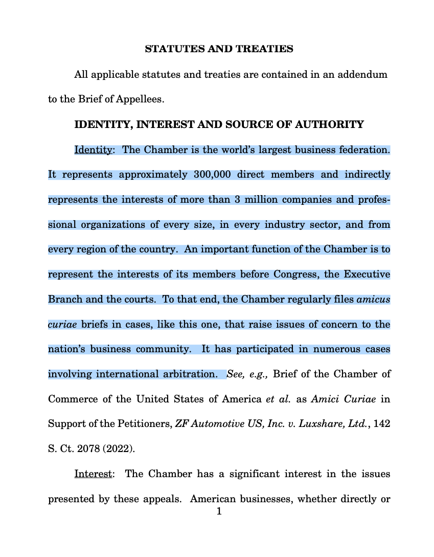 La Cámara se presenta como “la federación empresarial más grande del mundo. Representa a unas 300.000 entidades corporativas y gestiona los intereses de más de 3 millones de empresas y organizaciones profesionales de todo tipo de tamaño, ocupadas en todos los sectores de actividad y con presencia en todas las regiones de nuestro país. Una función importante de la Cámara es representar los intereses de sus miembros ante el Congreso, el Poder Ejecutivo o los tribunales. Con ese fin, la Cámara presenta periódicamente escritos legales (amicus curiae) ante casos como éste, en el que se plantean cuestiones de interés para la comunidad empresarial del país. La Cámara ha participado en numerosos casos de arbitraje internacional a lo largo de los años”.