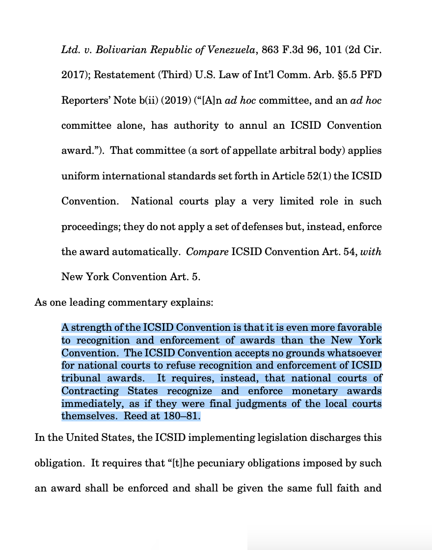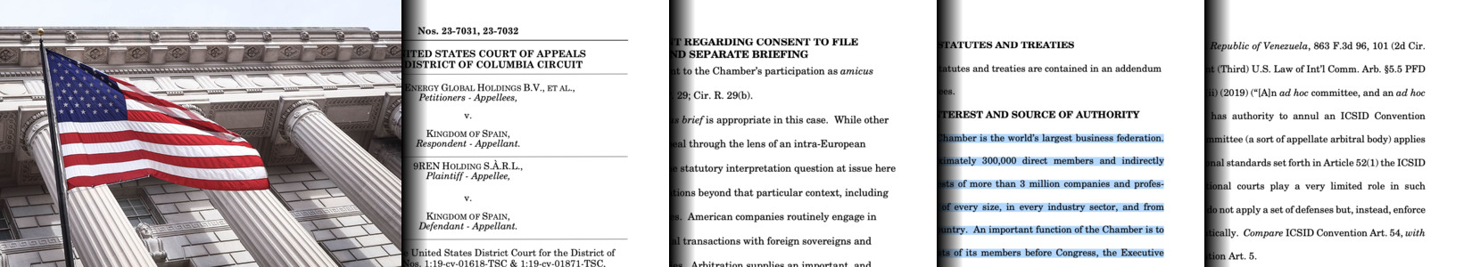 Las denuncias contra España invocan el Tratado de la Carta de la Energía (TCE), que delega posibles arbitrajes en el Centro Internacional de Arreglo de Diferencias relativas a Inversiones (CIADI), un tribunal de Banco Mundial en el que se dirime el 80% de este tipo de arbitrajes. España suscribió ambos acuerdos en la primera mitad de los años 90 y, si bien nuestro país ha comunicado que quiere abandonar el TCE próximamente, tal salida no tendría efecto en los procesos por dos motivos: (1) España era un país miembro del TCE cuando se retiraron las primas renovables de forma retroactiva, y (2) aunque España acabe abandonando el TCE, el cumplimiento del tratado sigue en vigor durante diez o veinte años, dependiendo del protocolo de salida acordado. Tomando en consideración todo esto, el amicus curiae de la Cámara de Comercio recuerda que el CIADI obliga a los países miembros de la convención a reconocer los laudos emitidos por el tribunal y contribuir a su cumplimiento efectivo. Es por este motivo que empresas como NextEra o 9REN han denunciado a España ante la justicia estadounidense: en virtud de las cláusulas propias a la adhesión de un país al TCE y el CIADI, es posible litigar en otras jurisdicciones e invocar ante ellas medidas compensatorias como los embargos que se han puesto en marcha en Reino Unido y que se esperan próximamente en Australia.