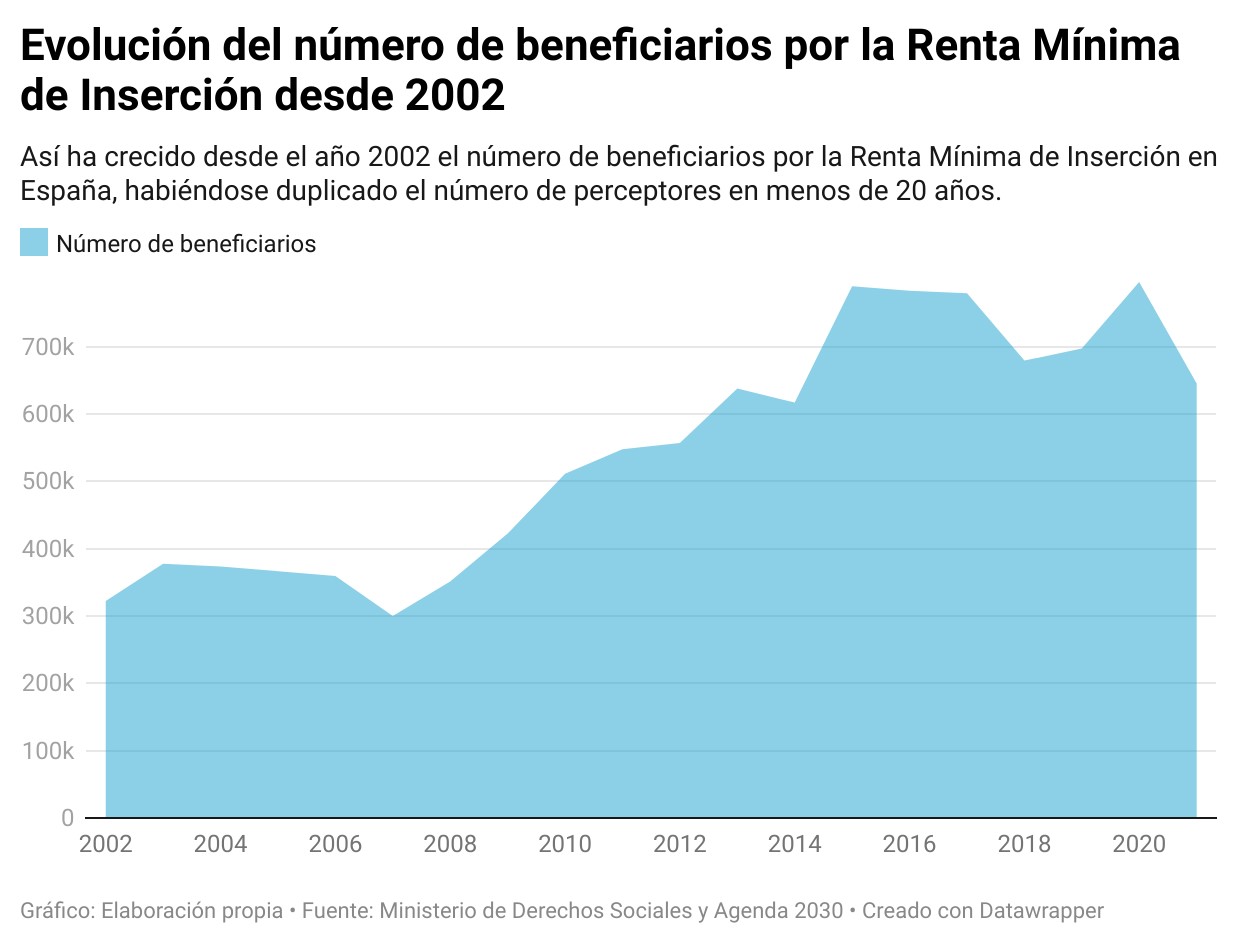 Si acudimos a los datos que nos ofrece el Ministerio de Derechos Sociales y Agenda 2030, podremos comprobar cómo ha sido la evolución de uno de los subsidios más importantes de nuestro país, que no es otro que la Renta Mínima de Inserción. Esta prestación existe en cada Comunidad Autónoma (con distintos nombres) y la cantidad asignada depende de distintos factores (familiares a su cargo, situación económica, etc.), con lo cual, lo que percibe un andaluz no tiene por qué coincidir con lo que cobre un vasco. De esta manera, si vemos como ha sido la transición en el número de perceptores de esta ayuda desde el año 2002 hasta el año 2021 nos encontraremos con lo expuesto en el siguiente gráfico: