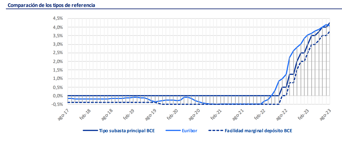 La Reserva Federal de EEUU ha elevado el tipo de interés oficial hasta 5,25%, mientras que el BCE lo ha situado en el 4,5% con el fin de combatir la inflación. El endurecimiento de la política monetaria impacta de lleno en el precio de las hipotecas.