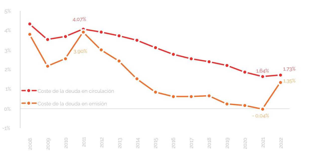 De hecho, en agosto de 2023, última estadística publicada por el Tesoro, el tipo de interés medio es de 2,037%, que muestra un importante incremento del coste medio, impulsado por el coste de emisión de la nueva deuda.