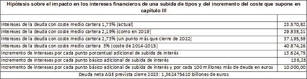 Pues bien, si el coste medio de la cartera subiese un punto porcentual respecto al cierre de 2022, los intereses financieros subirían en 13.624,75 millones. Es casi imposible que ello suceda en 2023, pues para que toda la deuda subiese, en media, a ese tipo, el endeudamiento bruto del año -refinanciación de amortizaciones y deuda nueva- tendría que tomarse muchos puntos porcentuales más caro, pero sí que es una realidad que gran parte de ese endeudamiento bruto del año se está encareciendo de manera importante.