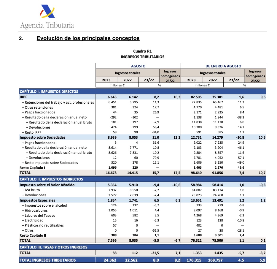 "El crecimiento [de la recaudación por el IRPF] en agosto fue intenso, como lo fue en los meses anteriores a pesar del freno a los ingresos que suponen los cambios normativos y de gestión. Sin estos cambios, los ingresos estarían creciendo a un ritmo superior al 13%", asegura, para colmo, la Agencia Tributaria. "Como se ha señalado anteriormente, son las retenciones sobre los rendimientos del trabajo y de las actividades económicas las protagonistas del crecimiento". Es decir, el esfuerzo de los trabajadores. "En agosto aumentaron un 11,3%, que es la misma tasa que se registra para el conjunto del año. En las grandes empresas (que son las únicas del sector privado que presentaron declaración en este mes) el incremento fue del 10,4%, inferior a los que se venían observando en los últimos meses y en el acumulado desde enero (11,3%)", explica Hacienda. "Los factores determinantes no parece que se hayan modificado sustancialmente, incluso el empleo se muestra más dinámico que en meses previos. Sin embargo, las subidas salariales no han sido tan elevadas como en la primera parte del año (ahora se comparan con los niveles salariales más altos de la segunda mitad de 2022) y el tipo efectivo se redujo, aunque, en principio, esto último se puede enmarcar dentro de las oscilaciones propias de la serie", apunta la Agencia Tributaria.