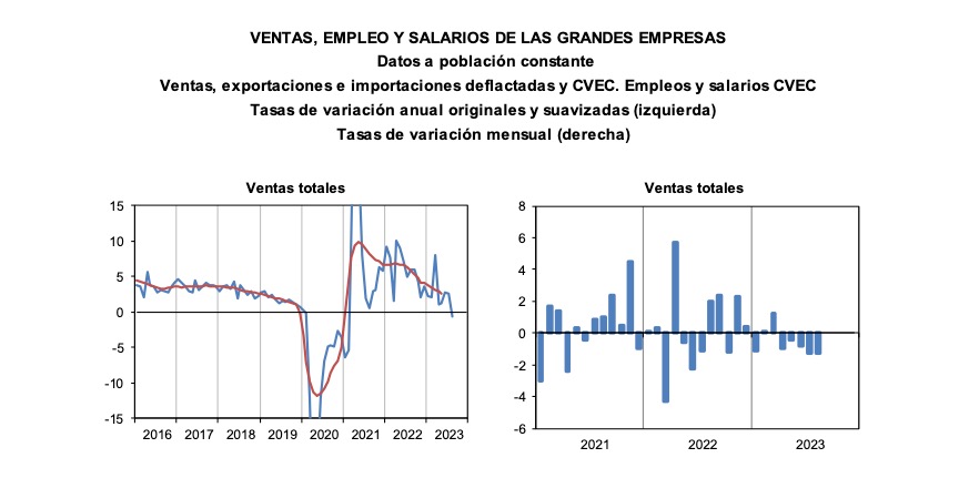 La base documental se encuentra en la propia Agencia Tributaria. Y refleja la evolución de las ventas de las grandes empresas hasta agosto del actual año. Y el informe oficial señala que "las ventas totales de las grandes empresas, deflactadas y corregidas de variaciones estacionales y de calendario, se redujeron en agosto un 0,7%, la primera tasa interanual negativa desde febrero de 2021". El documento admite que "los datos diarios de ventas provenientes del sistema de Suministro Inmediato de Información (SII) ya apuntaban en la misma dirección y con una magnitud pareja". Y la razón del "retroceso es consecuencia, básicamente, de la moderación que mostró el crecimiento de las ventas interiores, a lo que se sumó la nueva contracción de las exportaciones".