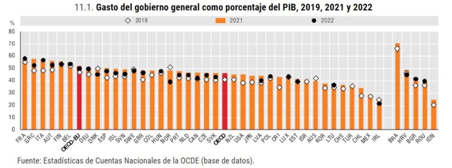 De esta forma, como hemos informado ya en Libre Mercado, España se sitúa como el octavo país de la OCDE que más gasta en el pago de los sueldos de sus empleados públicos en relación con el total de los costes de producción. En nuestro país éstos suponen el 51,7% del total, mientras que la media de la OCDE es del 43,2% (8,5 puntos porcentuales menos). Del mismo modo, en gasto general sobre el PIB, España también se encuentra por encima de la media de la OCDE, con una proporción del 50,6% del PIB en 2021 (un 9,3% más que el promedio de la OCDE), habiendo aumentado casi un 20% desde 2019, cuando éste era del 42,3%.