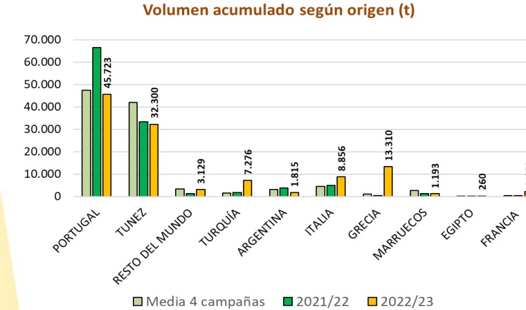 Asimismo, la cantidad de aceite de orujo importada desde Marruecos entre octubre de 2022 y abril de 2023 fue de 2.567 toneladas, algo más del 5% del total (48.904 toneladas), por lo que en este caso sí podría notarse algo más, puesto que, por otra parte, se ha disparado en nuestro país el consumo de este aceite de orujo en un 19%.