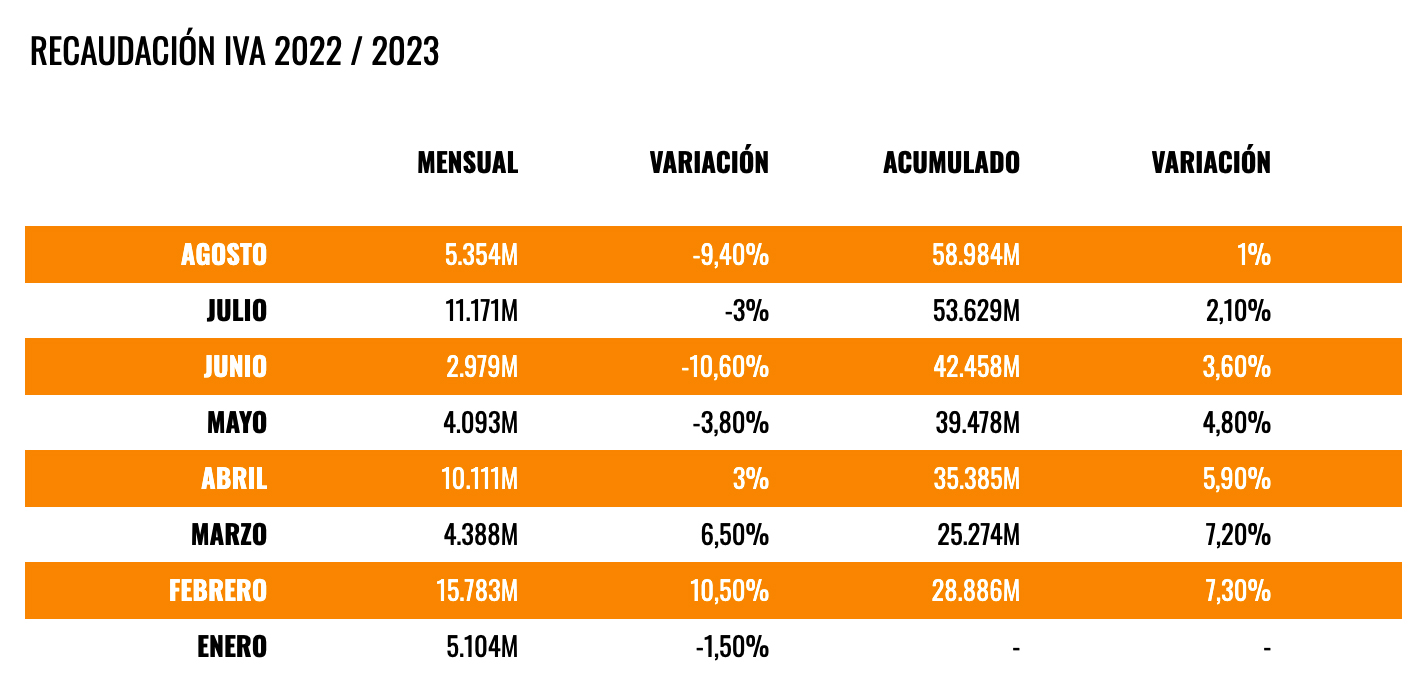 Sin embargo, a pesar del éxito recaudador del IVA desde 2021, en los últimos meses de este año, los datos de la Agencia Tributaria atisban los primeros síntomas de agotamiento. Las últimas cifras publicadas relativas al mes de agosto revelan que en el octavo mes del año las arcas del Estado ingresaron 5.354 millones de euros gracias al IVA, lo que supone un 9,4% menos que lo que ingresaron en el mismo mes de 2022.
