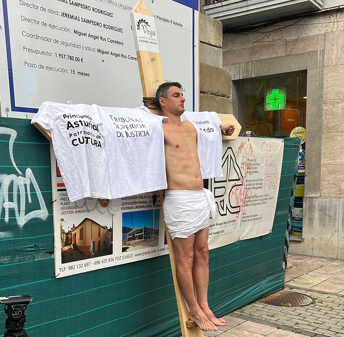 Su voz suena quebrada al otro lado del teléfono: "Estoy con ataques de ansiedad y llevo tres días sin dormir". Los tres que han pasado desde que el cierre de el Trastevere se hizo efectivo y él decidió pasearse por Grado -una pequeña localidad asturiana de poco más de 9.000 habitantes- cubierto tan solo por un pequeño trozo de sábana, a pecho descubierto y descalzo, mientras portaba sobre sus hombros una pesada cruz. Finalmente, y con la ayuda de varias personas, fue "crucificado". Incluso hubo latigazos: "Es una forma de llamar la atención sobre mi caso, porque de verdad que no hay derecho a lo que estoy sufriendo". El objetivo, al menos en parte, lo ha logrado, ya que su imagen se ha hecho viral.