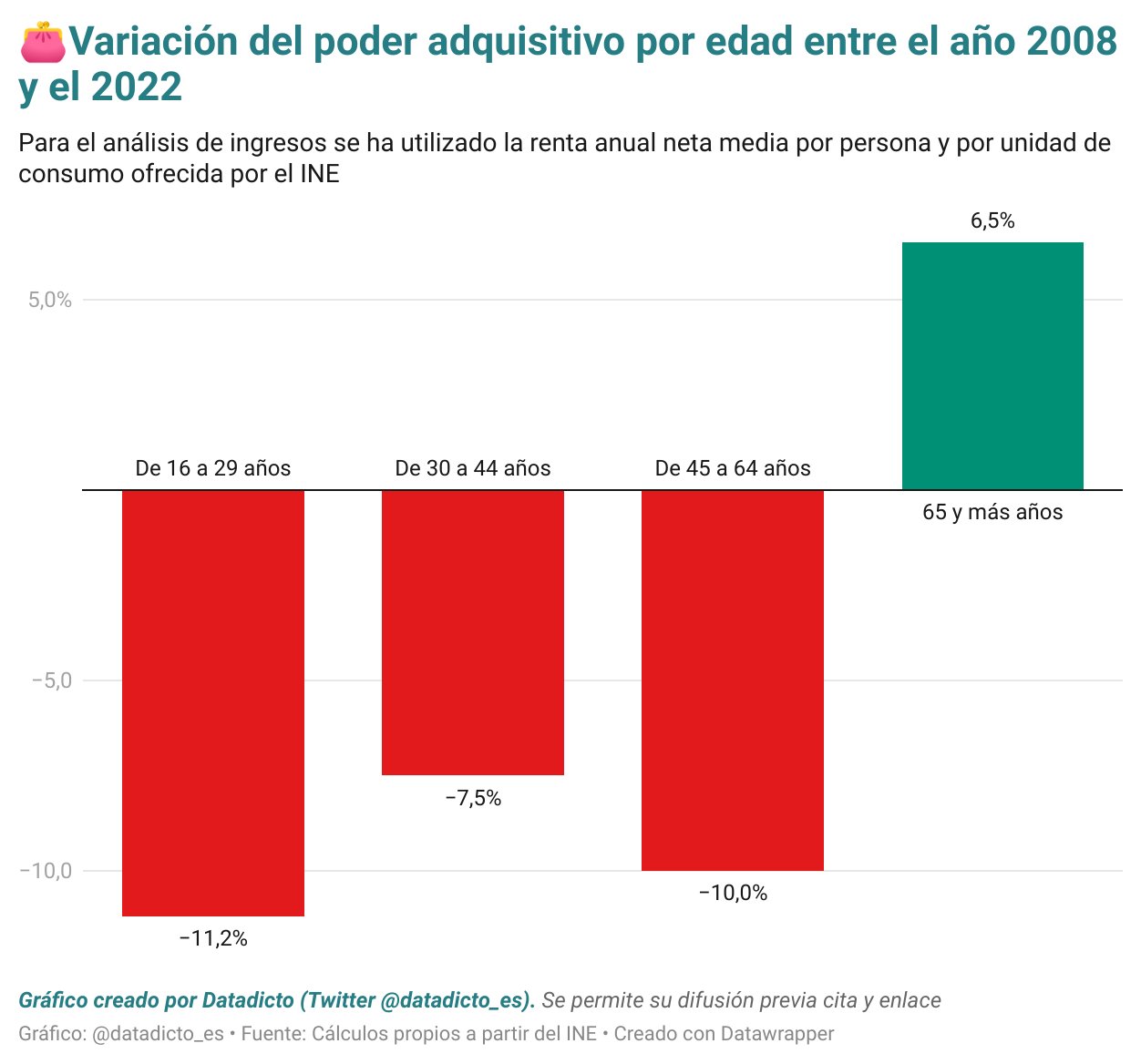 Sin embargo, a pesar de este empobrecimiento generalizado de la sociedad, hay vencedores y perdedores. Y los que ganan en este caso son los jubilados. Si se toma como base de referencia la crisis financiera de 2008, excluyendo así la burbuja económica previa, el grupo de población mayor de 65 años es la única que ha ganado poder adquisitivo, un 6,5%, según datos oficiales del INE elaborados por Datadicto, tomando en consideración la renta anual neta media.