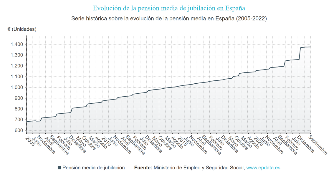 Otra forma de verlo es comparando la evolución de la pensión media con el sueldo medio. La pensión media ha pasado de 821 euros al mes a cierre de 2008 a 1.196 euros en 2021, lo que supone un aumento del 46% (y a 1.376 euros en septiembre de este año, lo que supone un incremento próximo al 70%).
