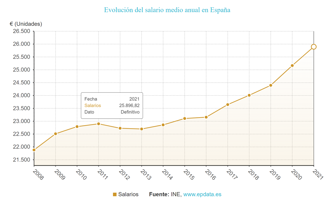 Por su parte, el sueldo medio de los españoles ha pasado de 21.880 euros a 25.900 euros en 2021 -último dato disponible del INE-, un aumento del 18%, insuficiente para compensar la inflación acumulada durante este mismo período, superior al 30%.