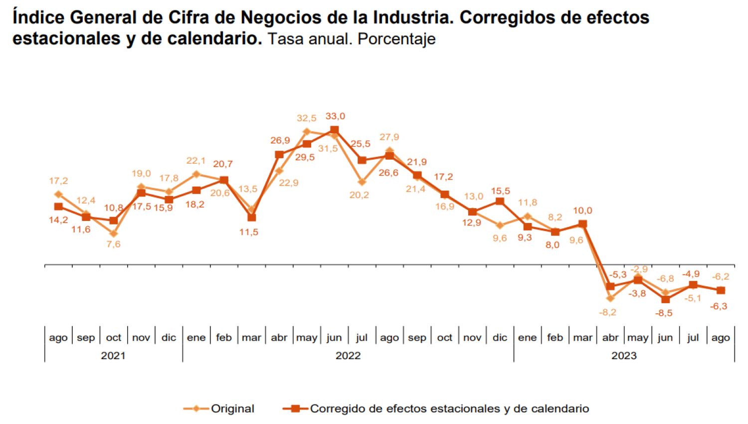 La industria española continúa su tendencia a la baja. Después de cuatro meses de importantes descensos de su cifra de negocios, el sector cayó un 6,2% en agosto respecto del mismo mes del año anterior. De este modo, su volumen total de ventas disminuyó por quinto mes consecutivo, arrastrado por el retroceso de las ventas de la energía y de los bienes intermedios, que cayeron un 17,7% y un 13,1%, respectivamente, de acuerdo con los datos publicados este miércoles por el INE. No obstante, también disminuyeron las ventas de los bienes de consumo duradero (en un 7,6%) y los bienes de equipo (un 0,9%). Sólo los bienes de consumo no duradero experimentaron un aumento en sus ventas, que fue del 4%.