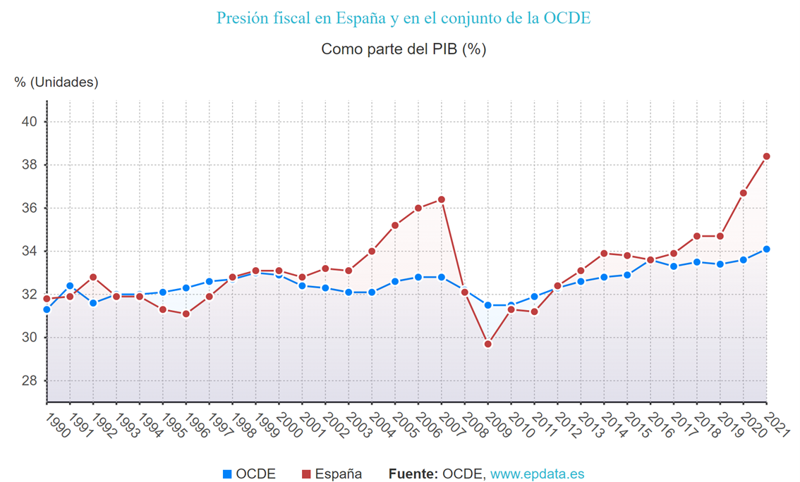 La presión fiscal en España, que llegó a situarse cerca del 30%, se ha disparado cuatro puntos porcentuales en apenas una legislatura y supera cada vez más a la media de la OCDE.